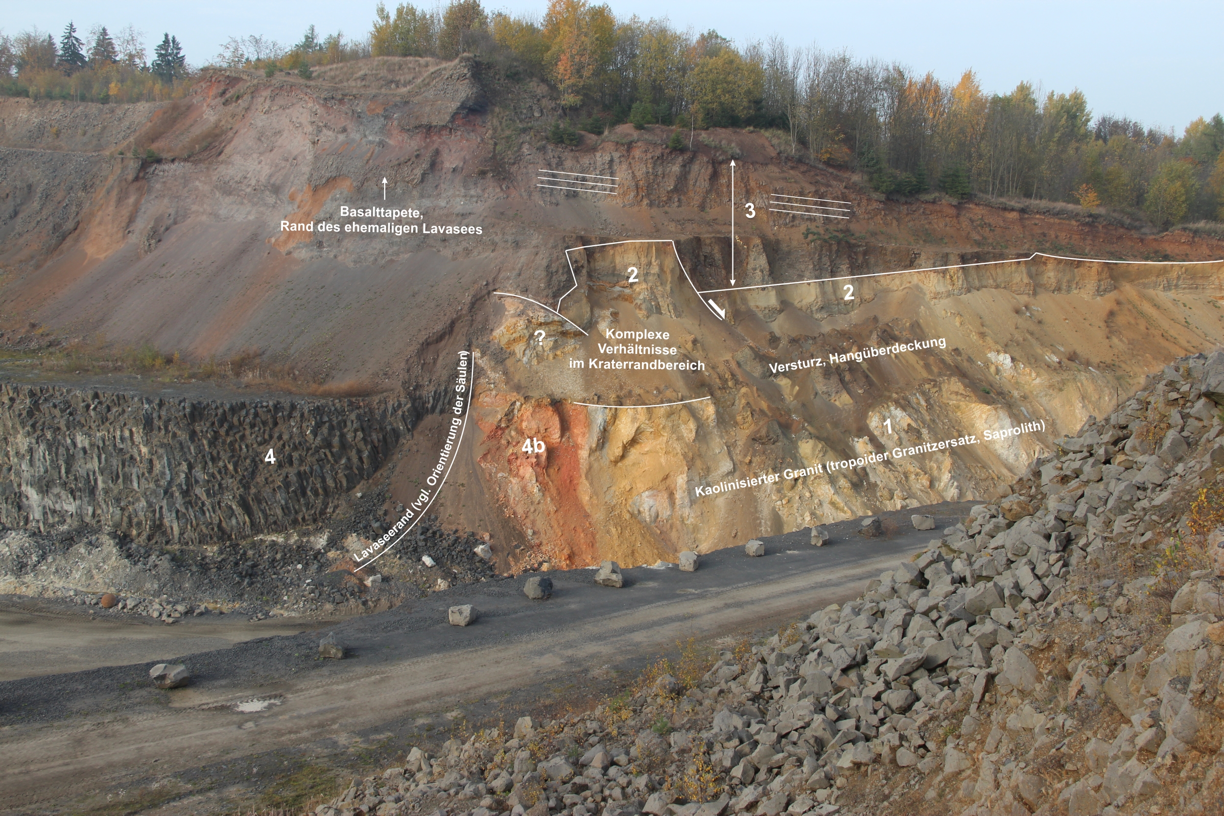 Phase 4: Der Krater füllt sich mit einem Lavasee; im Bild ist die zu Säulen erstarrte Lava zu erkennen. Am Kontakt der Lava zum Gesteinszersatz (am Kraterrand) kommt es zu hydrothermisch verursachten Veränderungen (sichtbar an der Rotfärbung durch Oxidation infolge der Spaltung von Wasser aus dem feuchten Gesteinszersatz und Freisetzung von Sauerstoff).