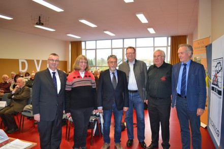 Dr. Alexander Saftig (links im Bild) und Professor Lothar Viereck (rechts im Bild) ehrten die Mitglieder (Zweite von links und dann von links weiter) Brigit Arden, Winfried Stieldorf, Georg Moesta und Wolfgang Riedel.