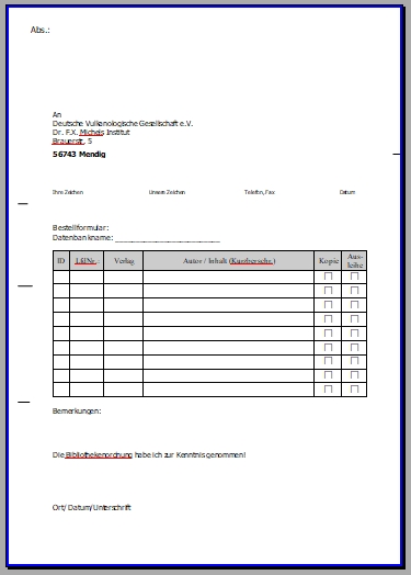 Anschrift: Deutsche Vulkanologische Gesellschaft e.V., Dr. F.X. Michels Institut, - Bibliothekar -, Brauerstr. 5, 56743 Mendig