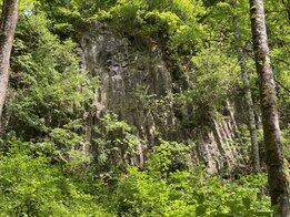 Doch bevor wir das Bachtal erreichen, müssen wir noch den engen-steilen Pfad durch die Wolfsschlucht hinabsteigen, ein ehemaliger Steinbruch, dessen Wände aus eindrucksvollen Basaltsäulen bestehen. Im Nachmittagslicht (aber erst auf Hinweis von Prof. Viereck) schön zu erkennen: eine waagrechte Klüftung in den Säulen, Folgen einer Kontraktion längs der Säulen während des Abkühlens).