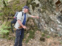 Damit ist das Ende der Tour fast erreicht, wir müssen nur noch den langen Weg im engen Tal der Kleinen Kyll zum Zielpunkt Heidsmühle hinauf wandern, mit allmählich langsamer werdenden Schritten. Da überrascht nochmal ein bemerkenswerter Anblick im geschieferten Devongestein: zwischen steil stehenden Schieferplatten liegt eine Schicht mit fast waagrecht lagernden, etwa eine Handbreit dicken und etwa zwei bis drei Handbreit langen Säulen. Das erinnert viele an einen Basaltgang, was es aber nicht ist, sondern eindeutig Sandstein! Deutung durch Prof. Viereck: Die steil stehenden geschieferten Platten enthalten plättchenförmige Tonminerale, die waagrechten Sandsteinsäulen rundliche Quarzkörner. Aufgrund ihrer unterschiedlichen Form reagierten diese Komponenten verschieden auf die seitlichen Kompressionskräfte während der variskischen Orogenese. Die plattigen Tonminerale gaben dem Druck durch Verdrehung nach, was die mehr isotropen Quarzkörner der Sandsteinlage nicht mitmachten. Daher diese auffällige Diskordanz.