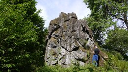 Nun gehen wir nicht den üblichen steilen Weg hinauf zu dem eindrucksvollen Kraterwall aus Schweißschlacken, sondern „unten herum“, den südwestlichen Kegelhang entlang, Richtung „Vulkanerlebnispark Mosenberg“. Und dieser Weg lohnt sich, können wir doch zwei besondere Lava-Gebilde bestaunen, erst eine aufrecht stehende Lava-Wand, wo offenbar Magma in eine senkrechte Spalte im Schlackenkegel eingedrungen war, und dann eine waagrecht liegende Lavaschicht innerhalb des Schlackenkegels. Haben sich hier Schlacken auf einem erkalteten Lava-Strom abgelagert? Offenbar nicht, denn die Schlacken sind im Kontaktbereich zur Lava deutlich thermisch verändert. Deutung durch Dr. Koziol: Die Schlacken waren bereits da, als sich eine Magma-Intrusion waagrecht in den Schlackenkegel hinein drängte: ein lehrreich-interessanter Aufschluss, dem Verfasser dieses Berichtes bisher unbekannt.